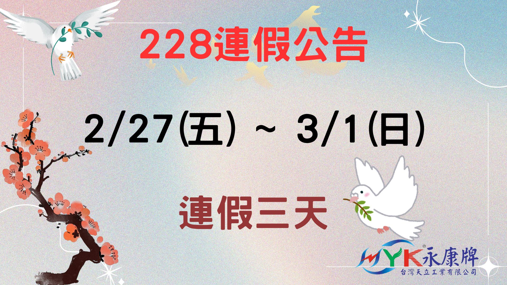 228和平紀念日-連假日期為2/27(五)-3/1(日) 三天